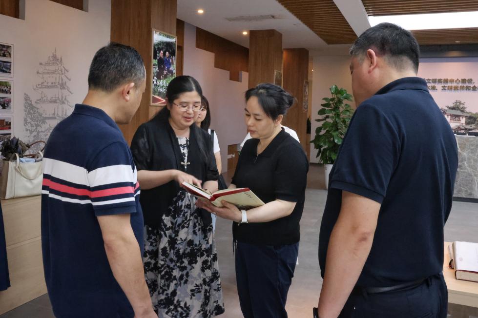 2019年,新都区新时代文明实践中心被纳入第二批全国试点;2020年,实现了文明实践阵地全覆盖。2023年6月29日。新都区新时代文化实践中心正式挂牌并投入使用,被评为省级示范中心。中心内拥有“新·人文会客厅”“新·声讲堂”“艺·新工坊”“知·新书社”等12个功能厅,集理论宣讲、艺术展呈、传统手工艺品制作、话剧川剧表演等多种功能于一体。在工作人员的讲解下,老师们逐一踏入这些功能厅,不仅了解了中心的建设背景及运营情况,也体验了当日丰富多彩的活动与服务。其中,“纪念艾芜诞辰120周年主题书画展”再现了诸多文化名人的风采及其艺术魅力,中心借此激活文化资源,助力文明实践项目创新发展;“中医馆诊疗服务”与“老年健康咨询活动”则是关怀居民健康福祉的具体体现,通过专业的医疗服务与健康咨询,积极践行着以人为本的服务理念。老师们同中心的工作人员、志愿服务者和居民交流交谈,就如何深化政治宣传的引领效能、增强社会服务的亲和力并提升针对多样化社会需求的精准施策等问题,进行了座谈交流。