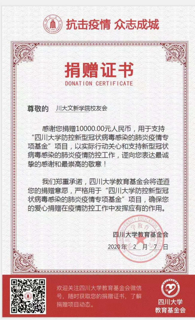 公司2009级员工,猪八戒网联合创始人刘川郁及其所在的猪八戒网,发挥行业平台优势,通过多种方式支持防疫阻击战。1月26日,猪八戒网便组织员工将500套防护服、960个护目镜送到了武汉市第四医院。2月3日,猪八戒网紧急向重庆市慈善总会捐赠现金100万元,以支持新型冠状病毒疫情防控工作。此外,猪八戒网还推出了“战疫情,百所高校万名学子在线实习”助力计划、“百城万企帮扶计划”,助力高校员工实习实训、区县企业复工复产。这些举措积极响应与践行了“一方有难、八方支援”的抗疫号召,也体现了为共同打赢疫情防控阻击战的文新人的担当。