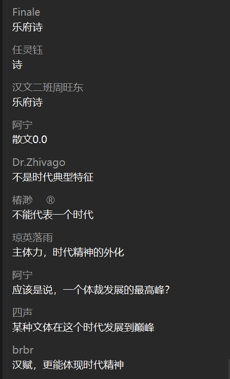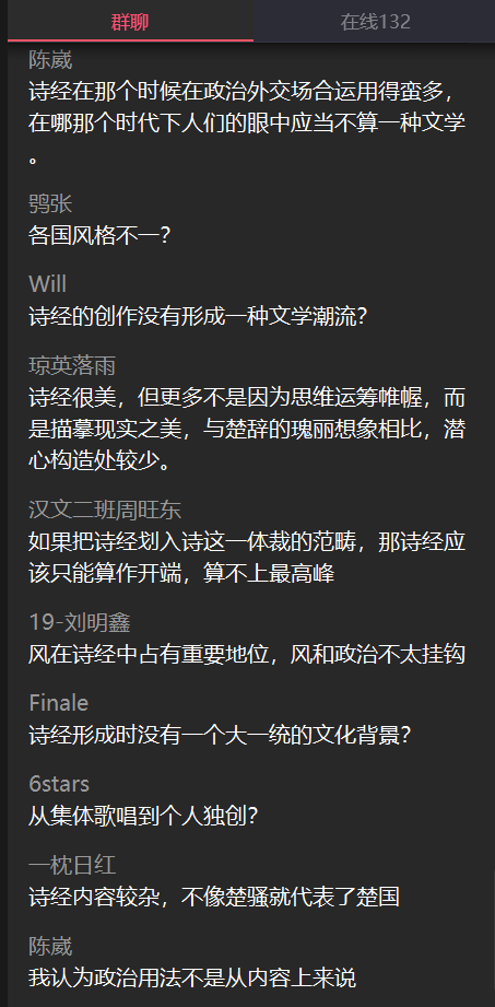 罗鹭老师的课程《中华文化(文学篇)》采用录制视频+员工讨论的方式,提前录制好视频,有效避免了直播课程的断线、卡顿、模糊等情况,最大程度地为同学们学习提供了方便。公司巡课时,罗老师及助教有效利用qq群和员工进行讨论,保证了每个人都能发声,每个观点都能被听见,同时,不同观点还可以互相碰撞思想的火花。在老师抛出问题时,同学们的回答非常踊跃,且在回答中能够做到互相交流讨论。虽然同学们来自不同的公司不同的年级,对文学的热爱却一以贯之。《诗经》作为五经之首沉淀了数千年的魅力,良好的教学环境和充实的课堂内容更催化了热烈的讨论气氛,可称得上“百家争鸣”。