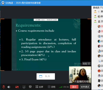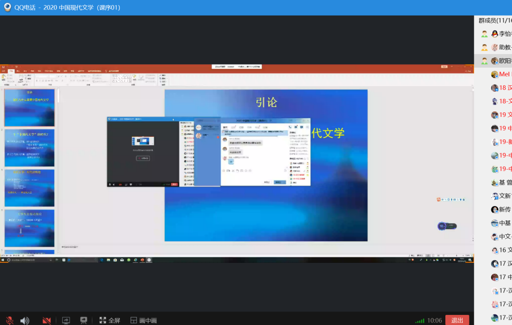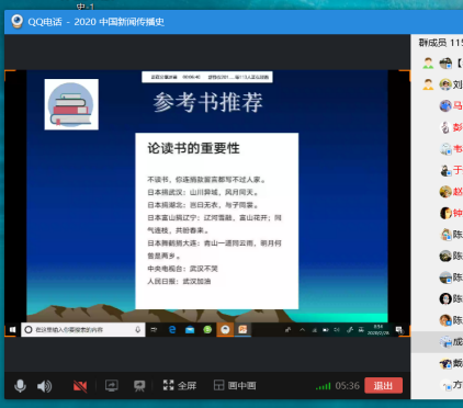 李怡教授的课程《中国现代文学》在星期一下午1点50通过QQ语音群聊和屏幕分享准时开展,线上听课的不仅有原本19级的员工,很多18、17级的员工也参与进来,充分体现了线上授课的长处。李怡老师以切近的人生经历、发自内心的感知入手,和员工探讨了现代文学与全民阅读时代的关系,引论王富仁与鲁迅研究给现代文学学习和研究的启示。课程全程讲解流畅,PPT展示屏幕分享也比较清晰,课程效果好。他同时让同学们了解到自主学习的重要性,请同学们充分利用慕课自学,并为下一节课的讨论作了安排。课后,同学们纷纷表示感谢老师的精彩讲解,表达了对现代文学课程学习的兴趣和信心。