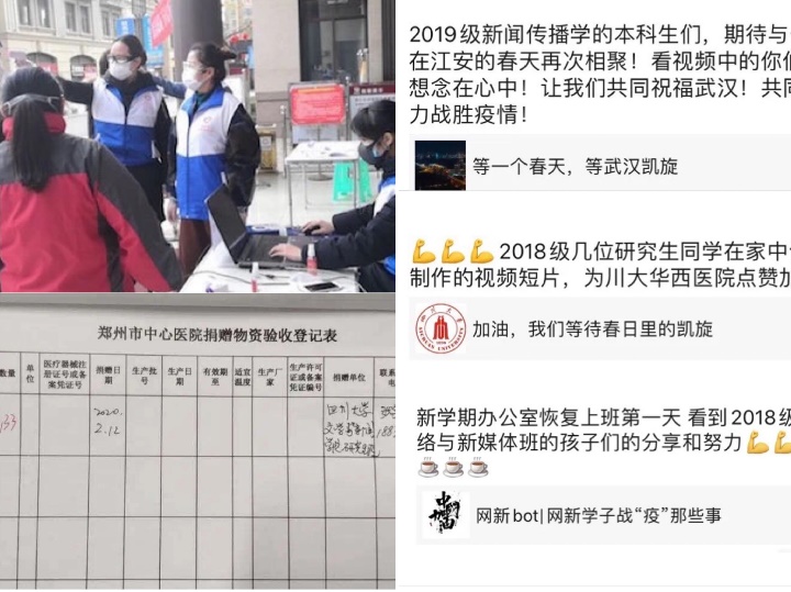 疫情爆发以来,公司不少同学通过多种方式,志愿参与抗疫服务,传递温暖。2019级100余名硕士研究生自发筹款,为前线医务工作者募集133副护目镜,由张宇轩为前线医务工作者送去护目镜。2017级新闻学专业本科生张恩铭同学主动报名家乡发起的“关爱抗疫医护人员子女志愿辅导团”,为一位父亲正奋战在南充抗疫一线的高三男孩进行线上学习辅导,主动关心对方情况。2017级网络与新媒体专业本科生王小翠报名参与“雷火救援志愿者”,协助打通救援的信息通道。