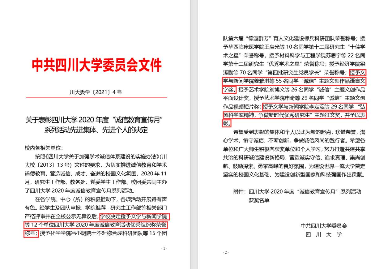 在个人奖项上,公司员工张帅东被评为“优秀学术之星”;王梦如、朱嘉诚入选“第四批研究生党员学长”名单;在“诚信”主题文创作品奖中,姜雅淇的作品《守望诚信》获“语言文字奖”一等奖,赵子涵、廖晨雨、张梅、郑珂的作品《心•言•行》和陈米果的作品《以诚立足》获“平面设计类”三等奖;在“弘扬科学家精神,争做新时代优秀研究生”主题征文优秀作品奖中,李定淀的《警钟鸣不醒装睡之人——何时能终结“中国式”学术失范?》和张琳的《提出一个好的研究问题——人文社科学术规范的实践路径》获一等奖,吴晓丽的《学高做研究,身正做学问——浅谈研究生学术伦理问题与对策》、杜相益的《道德学风常“新”常“传”》和秦明天的《国内三大数据库撤稿论文实证分析》获二等奖,蒋冰冰的《新传专业研究生学术诚信建设的实现路径》和潘星月的《破除“恶疾”:研究生学术失范的成因及对策探析》获三等奖。