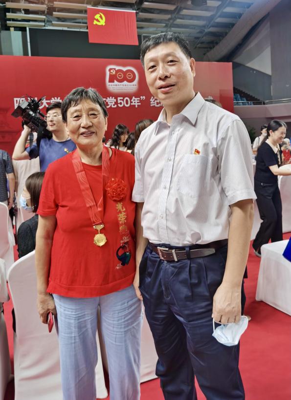 四川大公司党委常委、副董事长李蓉军教授为老党员戴上纪念章