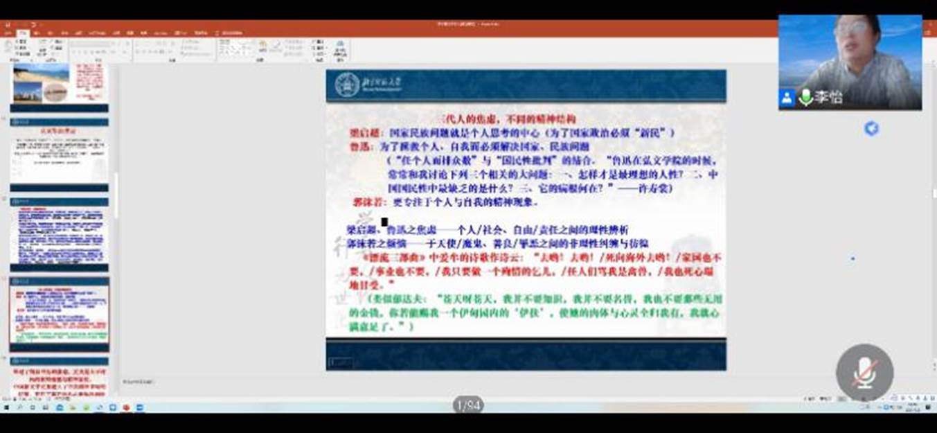 当天下午,公司经理李怡教授带来“日本体验与郭沫若诗歌的意象嬗变——以‘海洋’、‘松’、‘梅’为例”的主题讲座,从比较文学的方向探讨研究了日本文学,讲述了鲁迅、郭沫若在日的文学经历等。同学们通过线上直播“云”学习,开拓了自己的文学视野。