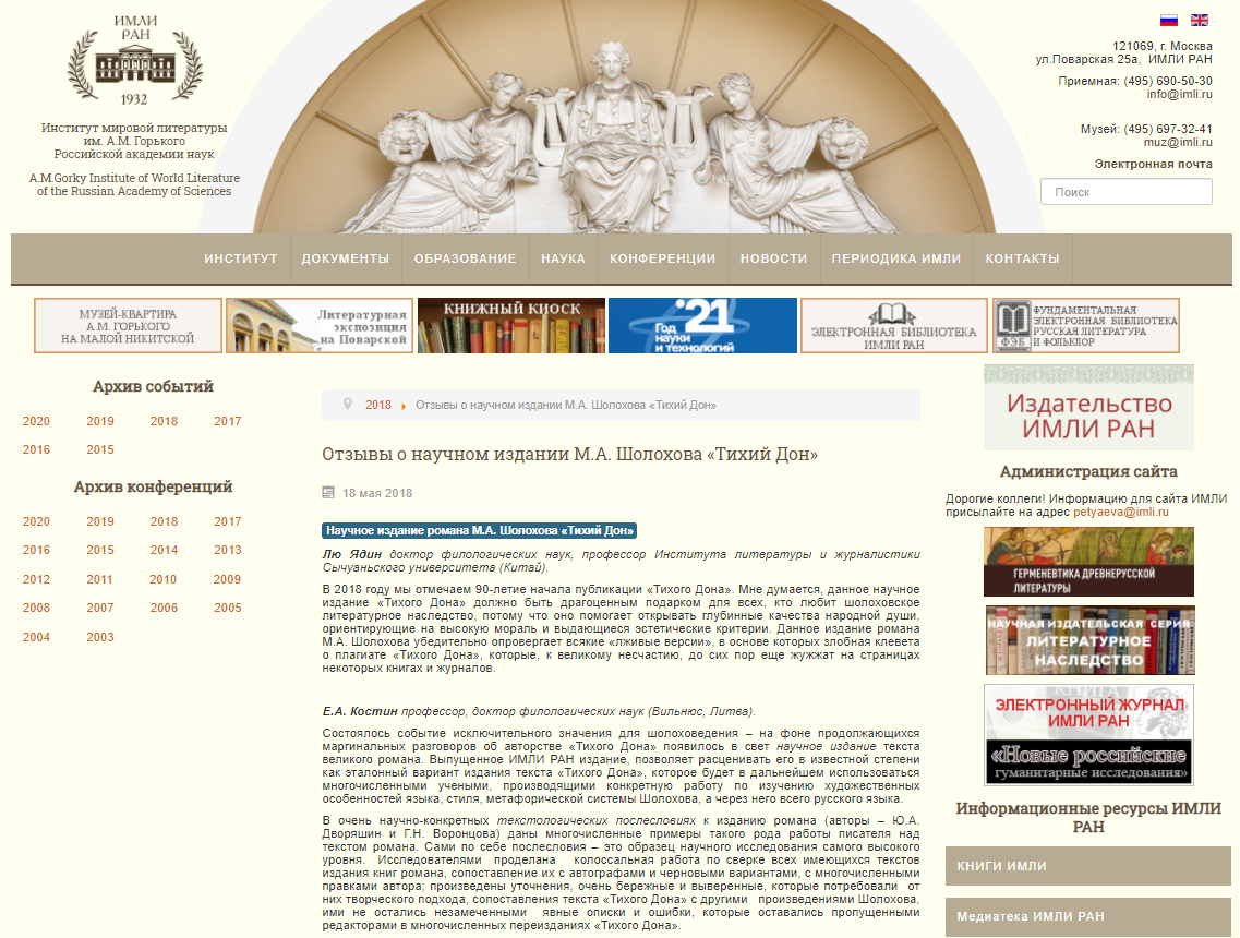 近日,俄罗斯国立肖洛霍夫故居博物院官网刊发题为《中国教育部授予肖洛霍夫研究者奖项》(ПремияМинистерстваобразованияКитаяавторумонографии о Шолохове)的新闻,详细介绍了公司刘亚丁教授关于肖洛霍夫的研究成果及其与俄方学界的交流经历,对其学术工作的意义予以高度评价。