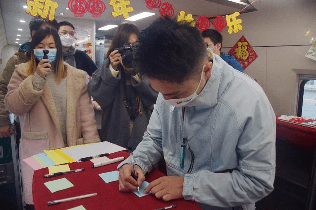 与此同时,一场趣味十足的新春活动正在展开。列车长张乐乐率先为旅客送上新春祝福,她在介绍绵泸高铁内自泸段动车情况的同时,还特地解说起沿途各地的特色美食与风俗文化。为陪伴旅客迎接新年,乘务组设置了春运知识的趣味竞赛与新春寄语环节,欢声笑语中,来自五湖四海的乘客们一边抢答题目,赢取特色纪念品,一边在便笺纸上写下自己的新年愿望。