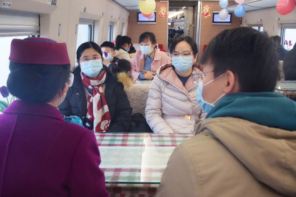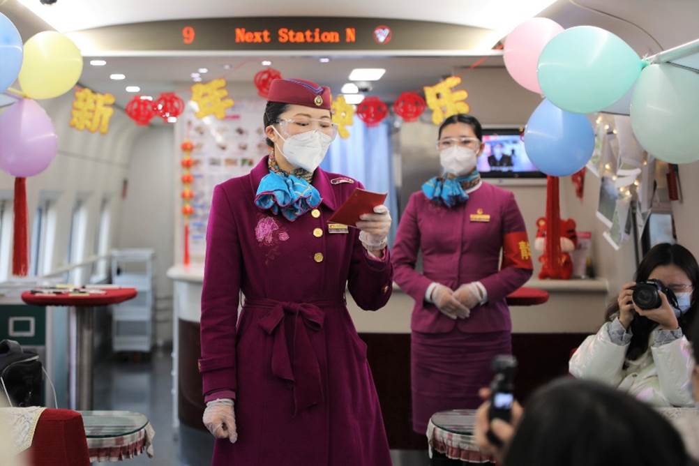 列车上,车厢宽敞明亮,旅客虽多,但并不显得拥挤。餐车车厢中,乘务员已经为春运旅客提前准备好了迎接新年的小纪念品与装饰品。中国结、气球、灯笼、祝福贴纸、虎年玩偶、途经地风景名胜照片等,让人感受到喜庆与欢迎的温暖气氛。