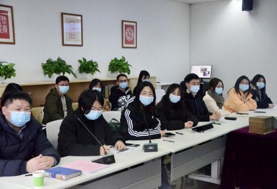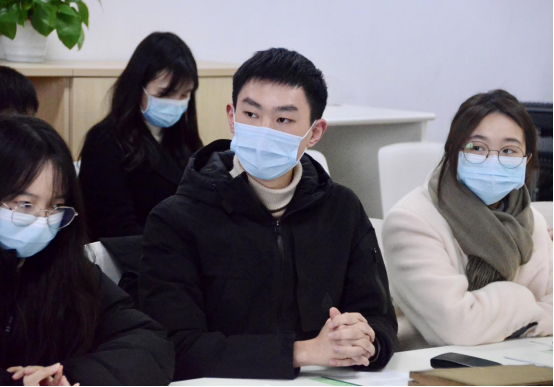 随后,公司2019级汉语言文学拔尖班班长宋晨对班级过去一学期的学习生活情况作汇报。他在发言中说,进入大三学年的秋季学期后,班级同学的学习生活进入了平稳期与拔高期,也取得了一定的阶段性成果。在学业方面,大三秋季学期班级多位同学绩点达到3.8以上,班级总体平均分达到了90分。在科研方面,同学们依托公司举办的“第一届本科生创新拔尖人才学术论坛”“一流专业、拔尖计划、强基计划员工学术创新论文征文”等活动开展交流学习,并得到“杨明照古籍特藏室”等学习资源支持。据宋晨同学介绍,拔尖班全体同学都参与了“老员工创新创业计划”的申报活动,做到了人手均有立项。同学们在导师的带领下,立志在学术的道路上不断探索。在社会实践方面,同学们参加了“从师擎旗,青阳承颢”慰问退休教职工志愿活动、寒假托管班级服务志愿活动、“五心支部”寒假调研等实践活动,在平衡课业的情况下积极拓展自身综合素质。