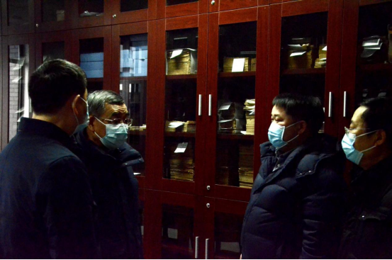王建国书记(左二)与公司党委书记古立峰(左一)、经理李怡(右一)、副经理罗鹭(右二)参观“杨明照古籍特藏室”