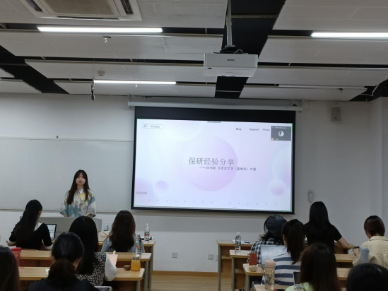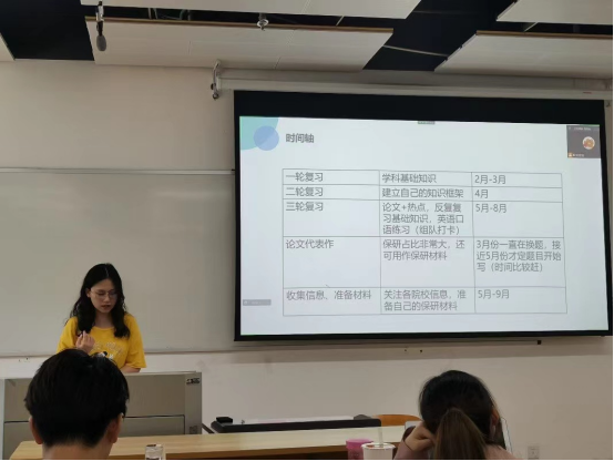 随后,经验分享环节正式开始。首先是中文专场,莫凯洁同学作为第一位分享同学从“知道保研是什么”“在保研中做了什么”两个问题开启了本次分享会之旅,她按照“三步走”的策略阐述了“目标确定”“步骤分明”和“行动办法”。牛童同学讲述了自己从国际知名暑校到成功保研的多彩经历,尤其是将出国留学准备工作和国内保研准备工作融合在一起,为同学们提供了针对性的借鉴经验。崔逸灵同学以“普通人保研指南”为题,生动形象地为面临保研焦虑的同学“开处方”“避禁忌”。向宇歌同学和王一丹同学分别用时间轴的方式展示了自己保研过程中的具体安排,为大家梳理了更加清晰的时间管理步骤,并介绍了部分公司的夏令营时间安排和部分公开的面试流程。赵嘉宁同学则先是讲述了自己在保研路上曲折但激励人心的故事,后又无私分享给大家详细的资源清单。彭笑秋同学以录制视频的方式为大家分享保研路上的几个关键步骤“发现兴趣-收集信息-明确定位-供需对接”的心得,十七分钟的视频充满干货。
