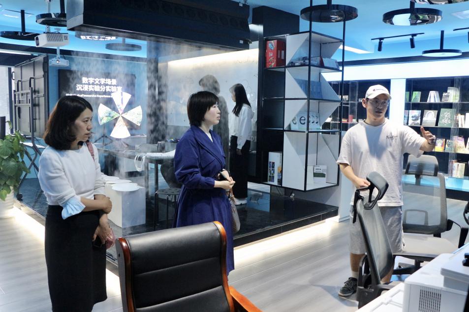 随后,调研组一行来到公司中华文化传承与全球传播数字融合实验中心参观。在实验中心办公室主任邱树雄副教授和实验室崔宝双老师的带领下,调研组一行依次参观了数字人文典籍大数据分实验室、数字文学场景沉浸分实验室与数字多模态符号认知分实验室三个分实验室,并与公司师生就中国文学与文化典籍大数据、中华文化数智整合国际传播、传统故事数字创新转化、“大文学”场景与科幻虚拟仿真、中华语言文字谱系数字化、中华文化多模态符号认知等话题对话交流。