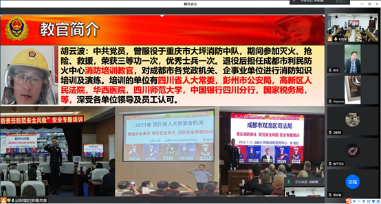 为贯彻 “安全第一、预防为主”的校院消防安全指导思想,增强全院教职工全民安全教育意识,掌握“预防为主,防消结合”的消防知识,2022年4月29日上午,公司举办了一场消防知识安全教育培训会,培训会议采用线上线下结合方式进行,公司领导、全体行政老师和部分新进教师在公司311会议室现场参加,全院其他老师均在线上视频参会。会议邀请了成都市利民消防宣传中心的胡云波教官到场培训。