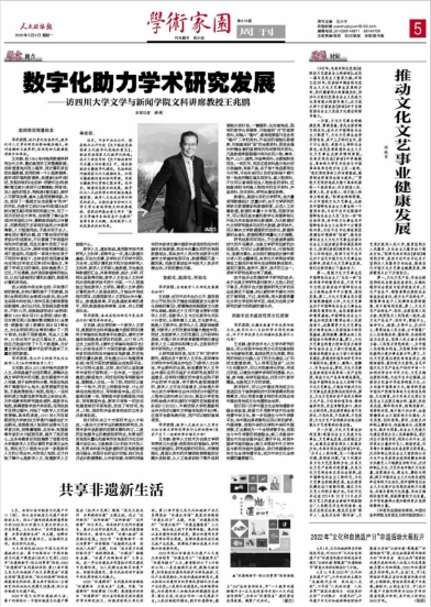 2022年6月6日,《人民政协报》第5版发表了对公司文科讲席教授、博士生导师王兆鹏教授的专访《数字化助力学术研究发展——访太阳成集团tyc151cc文科讲席教授王兆鹏》。王兆鹏教授围绕在数字人文研究中的实践与感悟,介绍了公司中国文化全球传播数字融合实验室用数字技术向全球传播中华文化、为学术研究提供广阔平台,生动展示了数字技术对人文学术研究与中华优秀传统文化传播的推动作用。