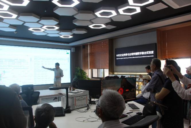 在宋耀研究员、胡易容副经理、姜振宇老师的带领下,老教师们又来到公司中华文化传承与全球传播数字融合科研实验室,依次参观了该实验室下属的数字人文典籍大数据分实验室、数字多模态符号认知分实验室及数字文学场景沉浸分实验室。之后,公司研究生讲解员孙海佩带领老教师们前往位于五楼的“刘福春中国新诗文献馆”参观,她现场解说了20世纪40年代以来中国新诗的著作、期刊、手稿、书信等红色新诗文献,老教师们听得认真投入,看得细致,时而与解说员提问交流,展现出极高的观摩热情。退休教师、原新闻公司经理邱沛篁教授表示,“看到公司这些年来的巨大变化、发展和进步,受到极大的教育和鼓舞,我们一定要继续为公司的更大更快发展献计献策、添砖加瓦,共同创造川大文学与新闻传播学科更加美好的明天!”