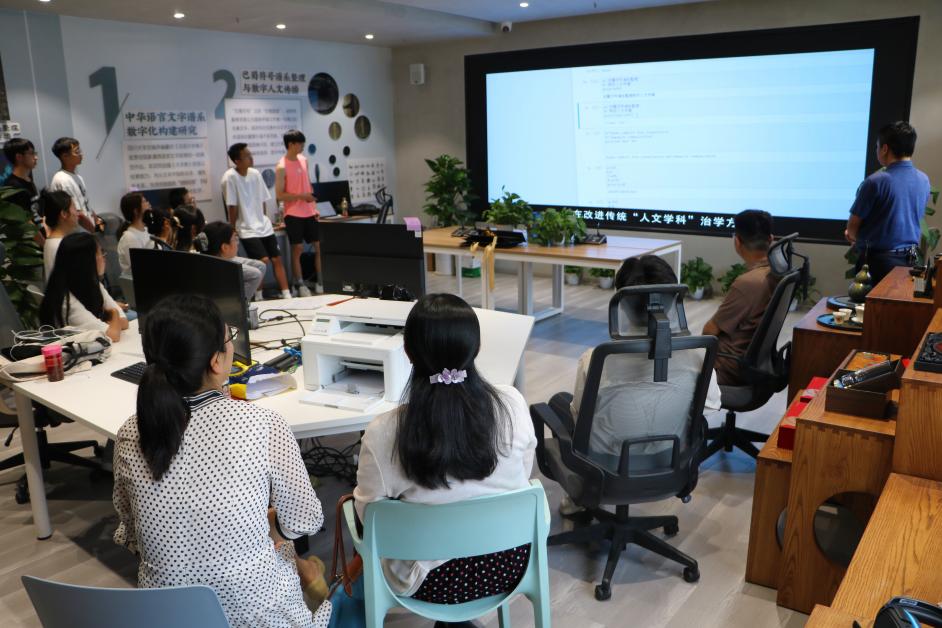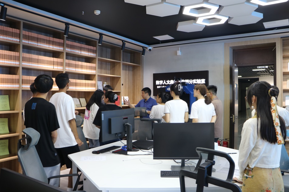 当天下午2点,西北民族大学新闻传播公司师生来到太阳成集团tyc151cc江安校区参访交流。在公司实验室主任邱树雄老师的介绍下,两院师生一起参观了公司中华文化传承与全球传播数字融合实验室,现场了解了数字人文典籍大数据分实验室、数字文学场景沉浸分实验室与数字多模态符号认知分实验室的功能定位与运用情况。