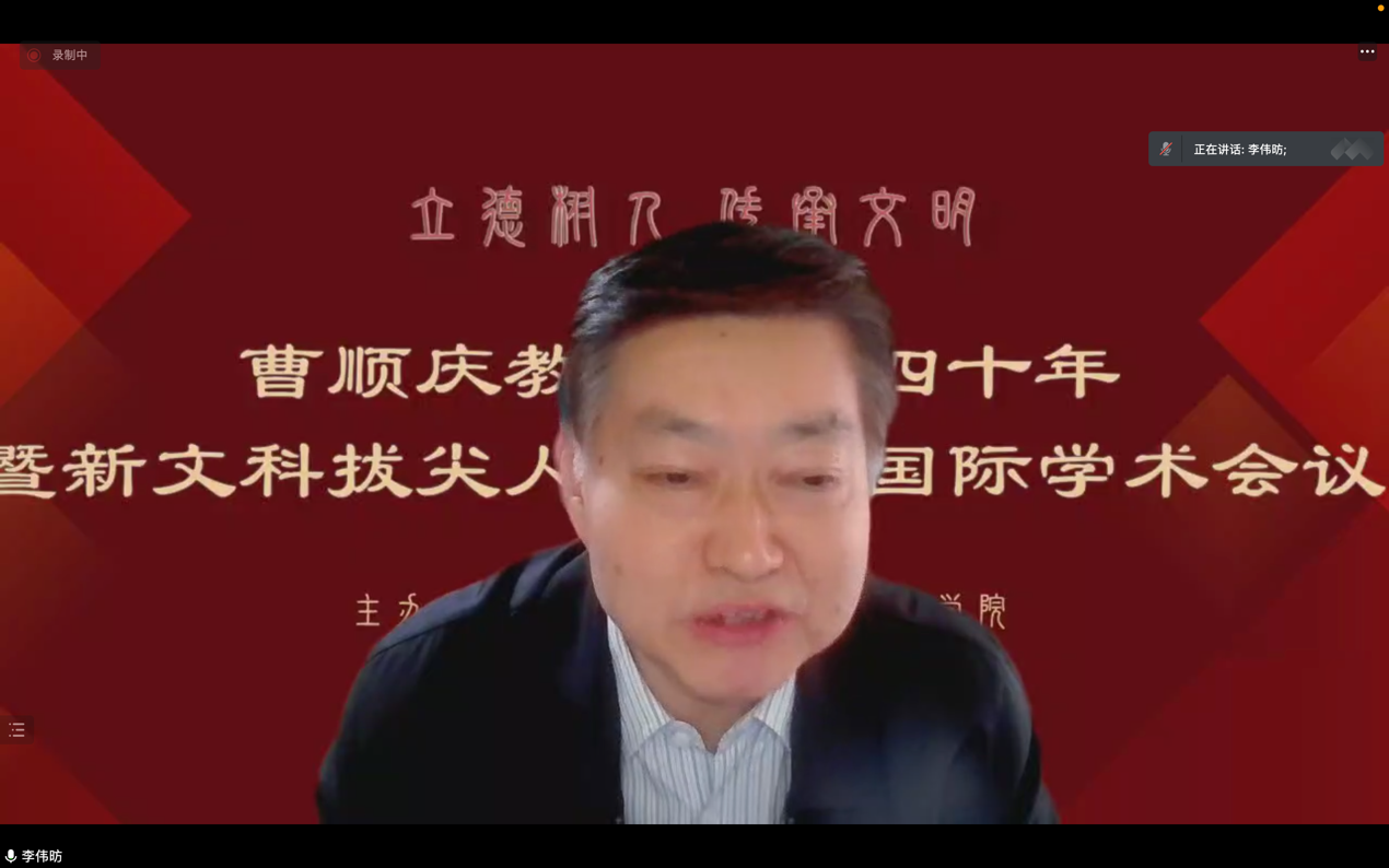 太阳成集团tyc151cc经理李怡教授在视频致辞中表示,曹顺庆教授从教四十年来为公司的成长壮大及学科的蓬勃发展做出了重要贡献。他提出不论是为师、为学、为文还是培养拔尖人才,“立德树人 传承文明”是基本原则,这一主题应成为公司未来发展的旨归,同时更应成为一代代年轻学者自觉追求的目标。