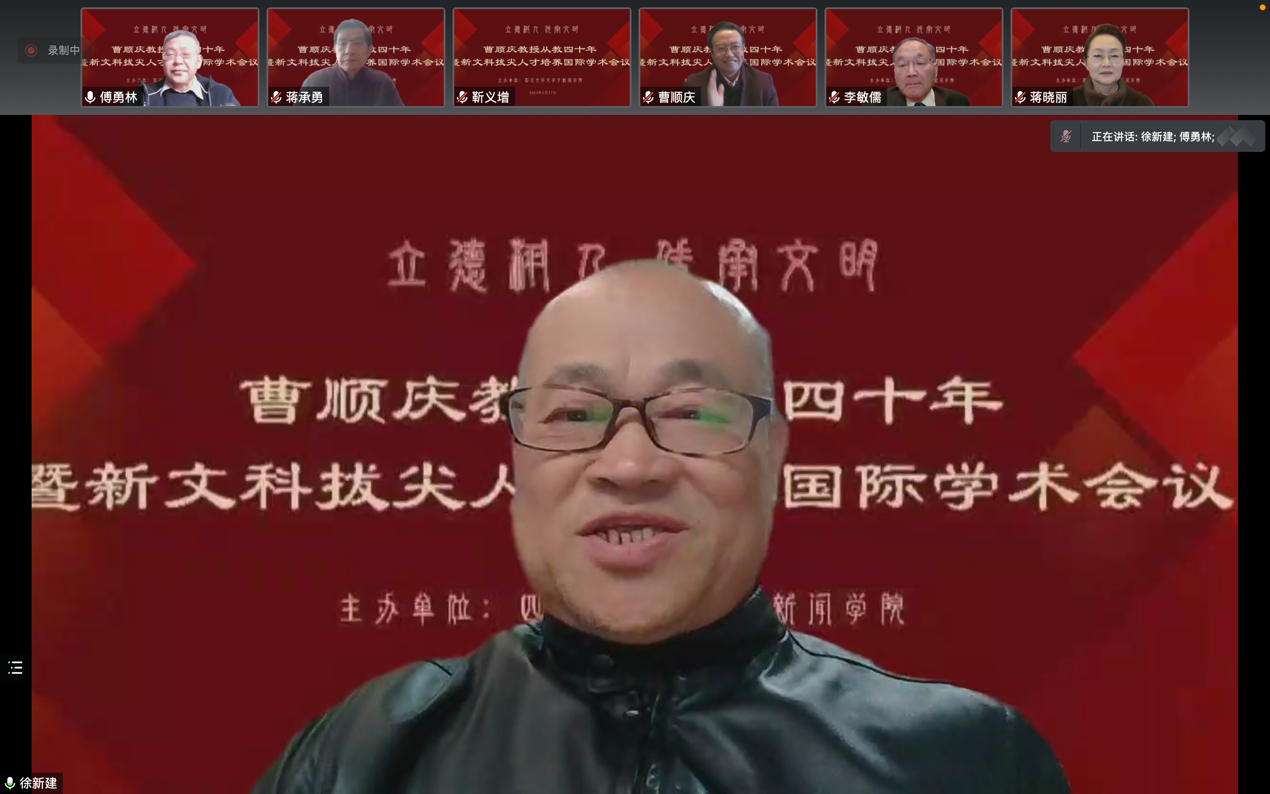 美国俄亥俄州立大学李敏儒教授在致辞中回忆了与曹顺庆教授共同求学的生活经历,称赞曹顺庆教授年少时便立志高远、学习刻苦、尊师重道,他本人即是立德树人、传承文明的代表。