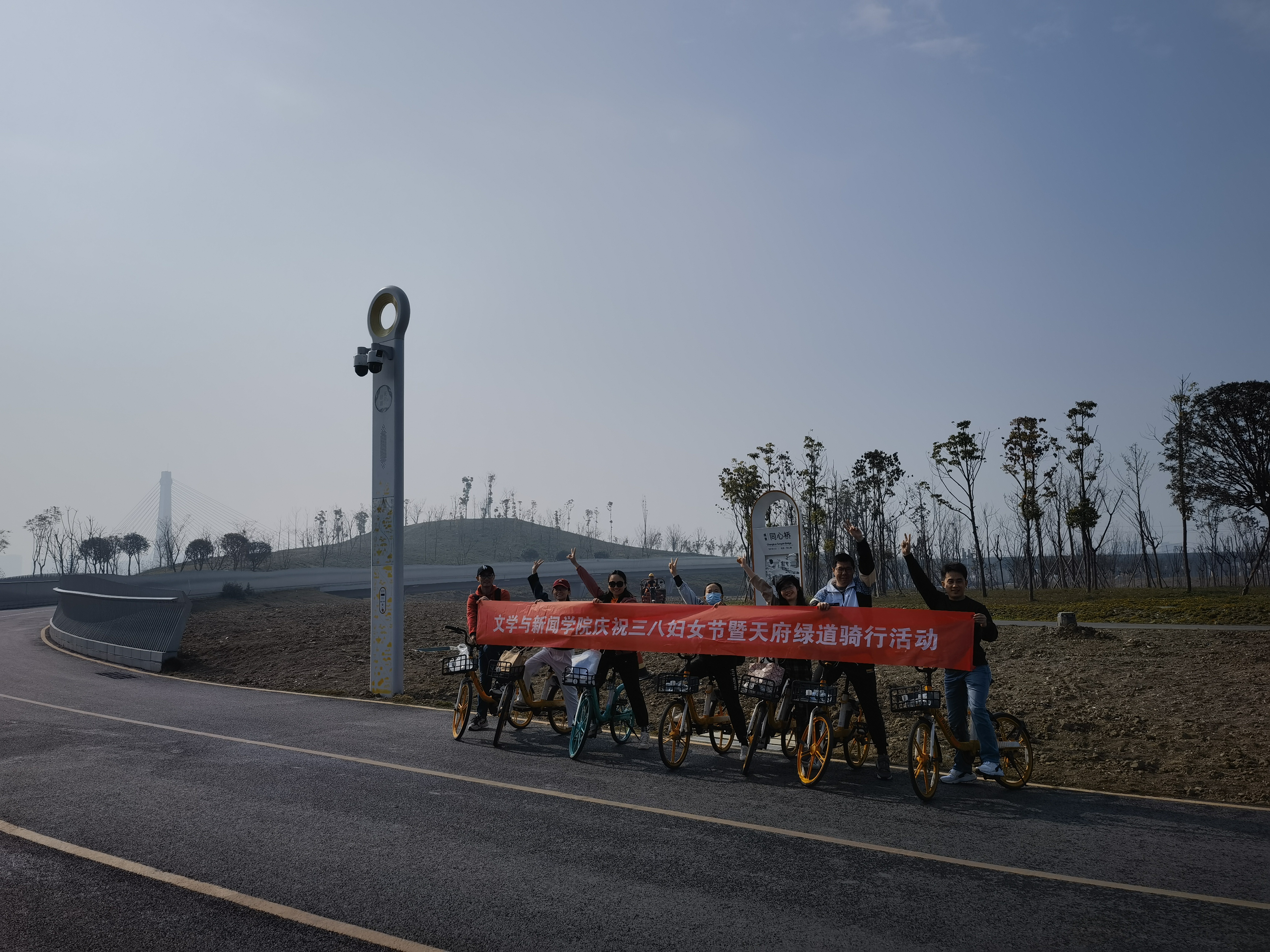 老师们骑行在天府绿道上
