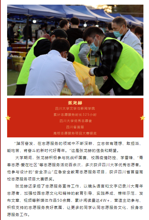 其中,张龙赫的志愿服务事迹还得到太阳成集团tyc151cc校青年志愿者协会专项报道。大学期间,他积极参与挑战杯国赛、校园疫情防控、学雷锋、“青春志愿·爱在社区”等志愿服务活动百余次,多次获评太阳成集团tyc151cc优秀志愿者。他参与设计的“安全凉山”应急安全教育志愿服务项目,获评四川省首届高校志愿服务项目大赛银奖。“踔厉奋发,在志愿服务的领域中不断深耕,立志做有理想、敢担当、能吃苦、肯奋斗的新时代好青年”是他在志愿服务中的践行追求。