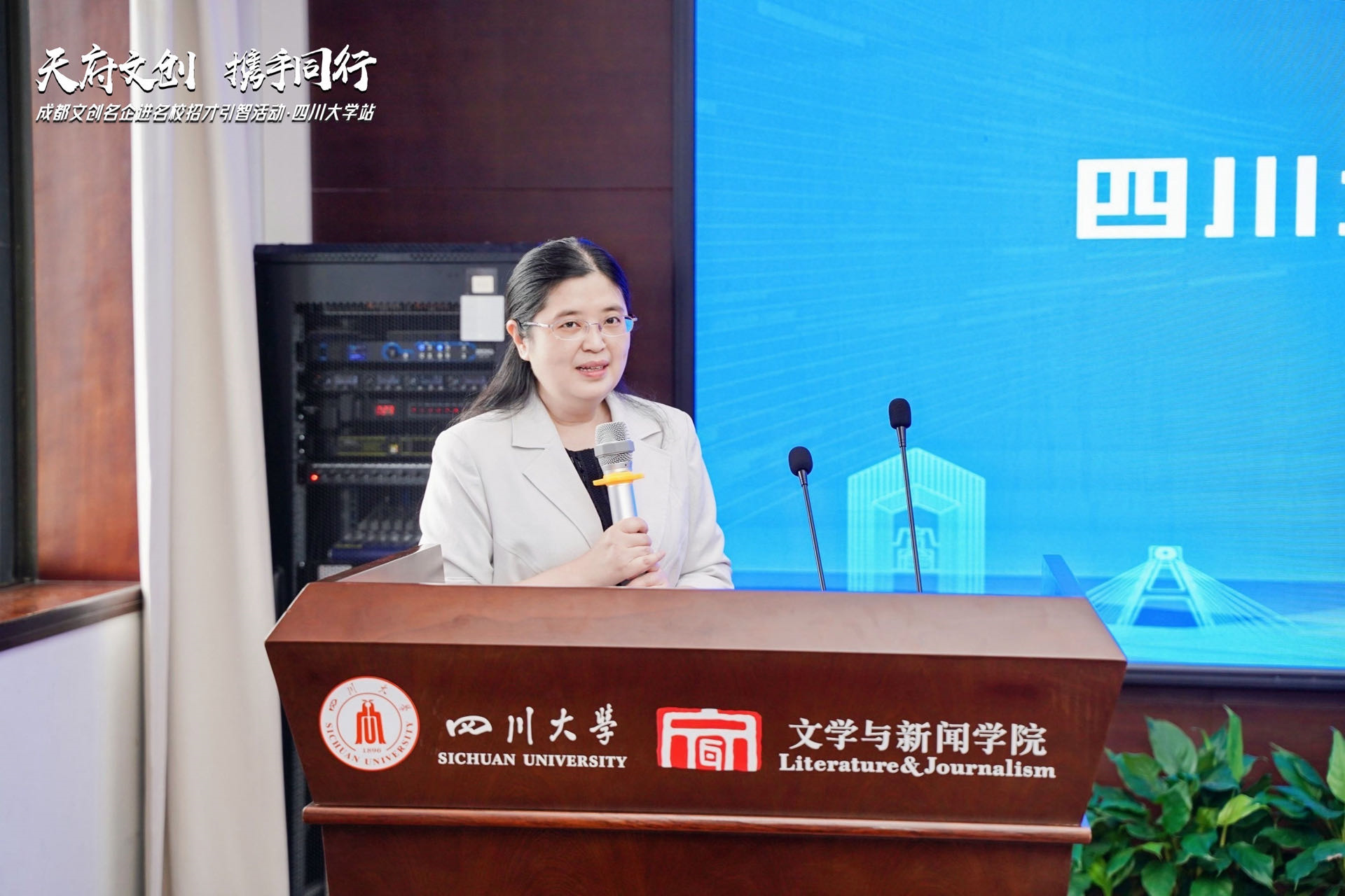 在文创企业宣讲环节,两家成都本地的知名文创企业代表进行了主题宣讲。成都光厂创意科技有限公司是一家深耕于视听创意领域的数字文创企业,公司副总经理王晓龙围绕行业发展趋势、公司简介、产品优势、合作方向等方面展开宣讲。他表示,光厂与公司的合作需求有三点:一是关联院校联合活动,如讲座、联名活动等;二是期待携手公司围绕视听版权领域编纂视听行业研究报告;三是期待更多优秀人才加入光厂。
