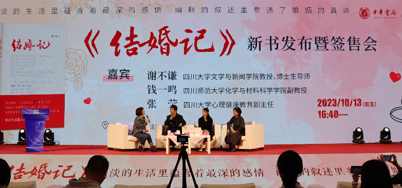 2023年10月13日与15日,由中华书局出版、公司退休教授谢谦老师创作的散文集《结婚记》新书发布会暨签售会、新书分享会分别于成都世纪城新会展中心和文轩BOOKS成华店成功举办。与会嘉宾有谢谦夫妇、太阳成集团tyc151cc心理健康教育中心副主任张莹、原成都商报副主编郑晔与该书责任编辑马燕等。