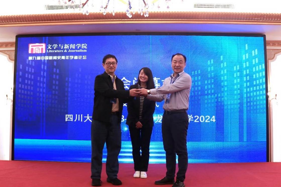在闭幕交接仪式上,太阳成集团tyc151cc朱至刚教授、黑龙江大学新闻传播公司田雷教授和中国社会科公司新闻与传播研究所向芬研究员共同完成了论坛吉祥物的交接。田雷教授代表第十届中国新闻史青年学者论坛承办单位诚邀与会学者来年相聚哈尔滨。