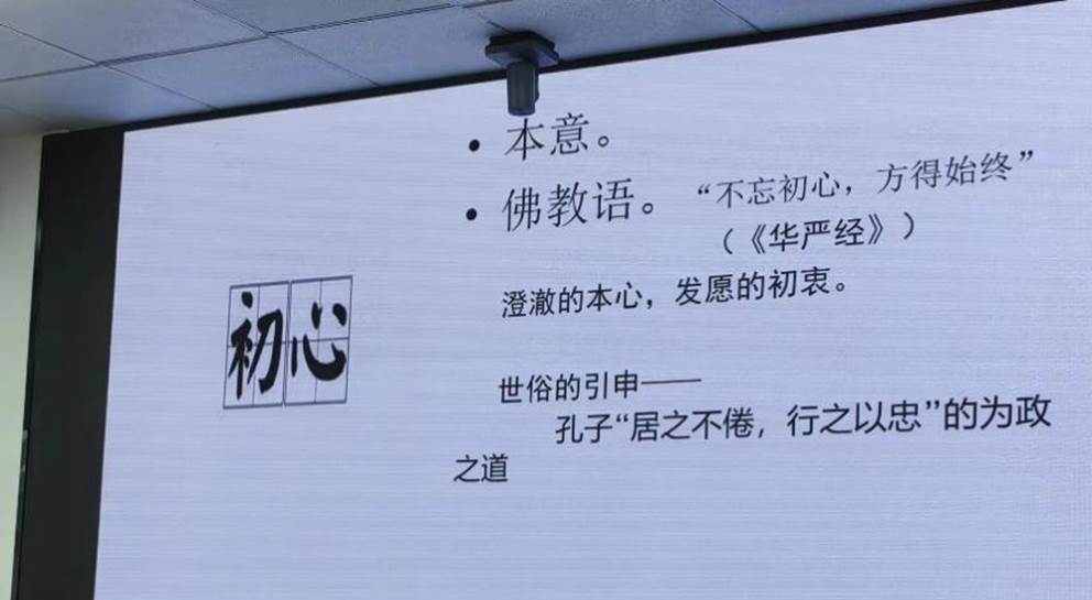 课程伊始,李怡经理首先围绕“初心”一词的本意进行细致论述,使同学们了解到“初心”作为佛家语“澄澈的本心、发愿的初衷”的原始含义,并对其泛化引申后“人原初之愿望”的人文意蕴和“居之不倦,行之以忠”的政治意涵有了更清晰的认识。