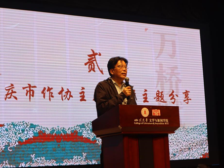 紧接着,重庆作协主席张者老师进行《万桥赋》创作的主题分享。张者老师分享了他的文学创作经历,谈到自己大学从律师到作家身份的转变以及《万桥赋》的创作思路与灵感。同时也深入探讨了虚构与真实的关系,认为要辩证看待历史和文学的真实性,提出了文学是虚构抵达真实的桥梁,以逻辑和心理为支撑点,总结出“文学作品源于生活却超越表面真实”的经验。