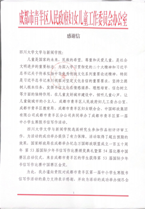 11月26日,成都市青羊区人民政府妇女儿童工作委员会办公室向公司发来感谢信,感谢公司对青羊区第一届中小员工寒假书信写作活动的的支持,同时向公司操慧教授、研究生辅导员雷子慧老师,研究生朱明、罗浩然、徐卓群、雷振宇同学致以诚挚的谢意。