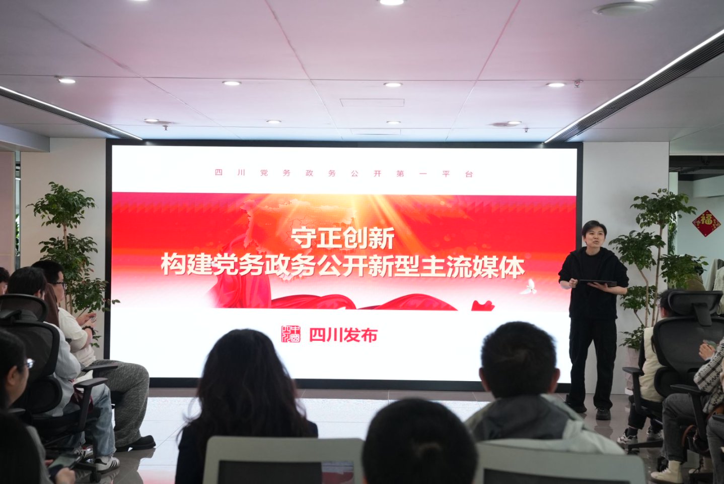 参观结束后,公司师生一行来到会客区与四川发布的采编老师们围绕新型政务媒体建设等主题展开深度交流座谈,并举行了《新型政务媒体的构建与传播——“四川发布”个案解析》新书发布仪式。