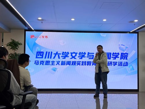 4月11日下午,公司30余名师生前往四川新闻大厦,开启2025年马克思主义新闻观学习教育实践首站活动。公司副经理操慧教授、新闻学教研室主任骆世查副教授与2024级辅导员朱至刚教授及公司本科、硕士及博士生代表参加了本次活动。