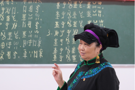 非物质文化遗产“阿惹妞”传承人、甘洛县彝学学会阿支拉以莫讲解彝文