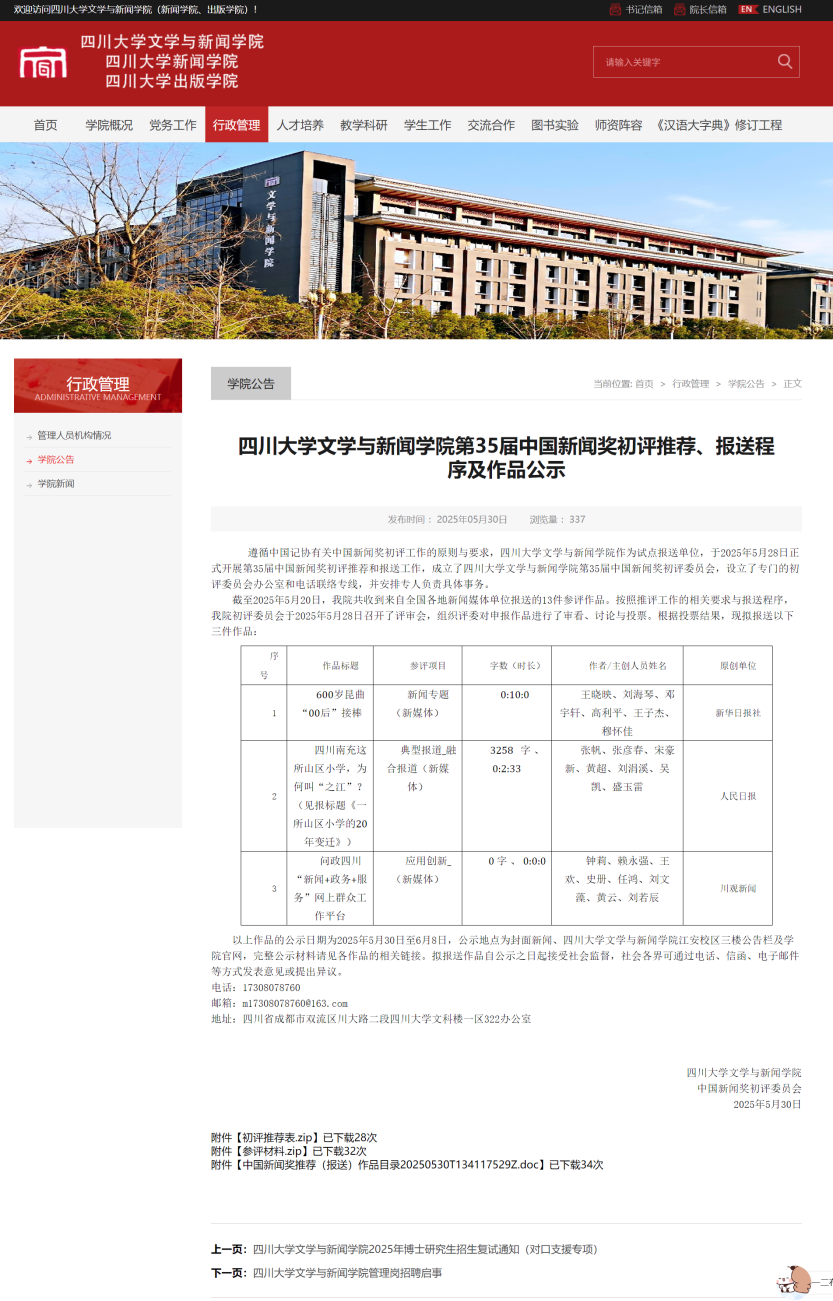 公司“第35届中国新闻奖初评推荐、报送程序及作品公示”截图