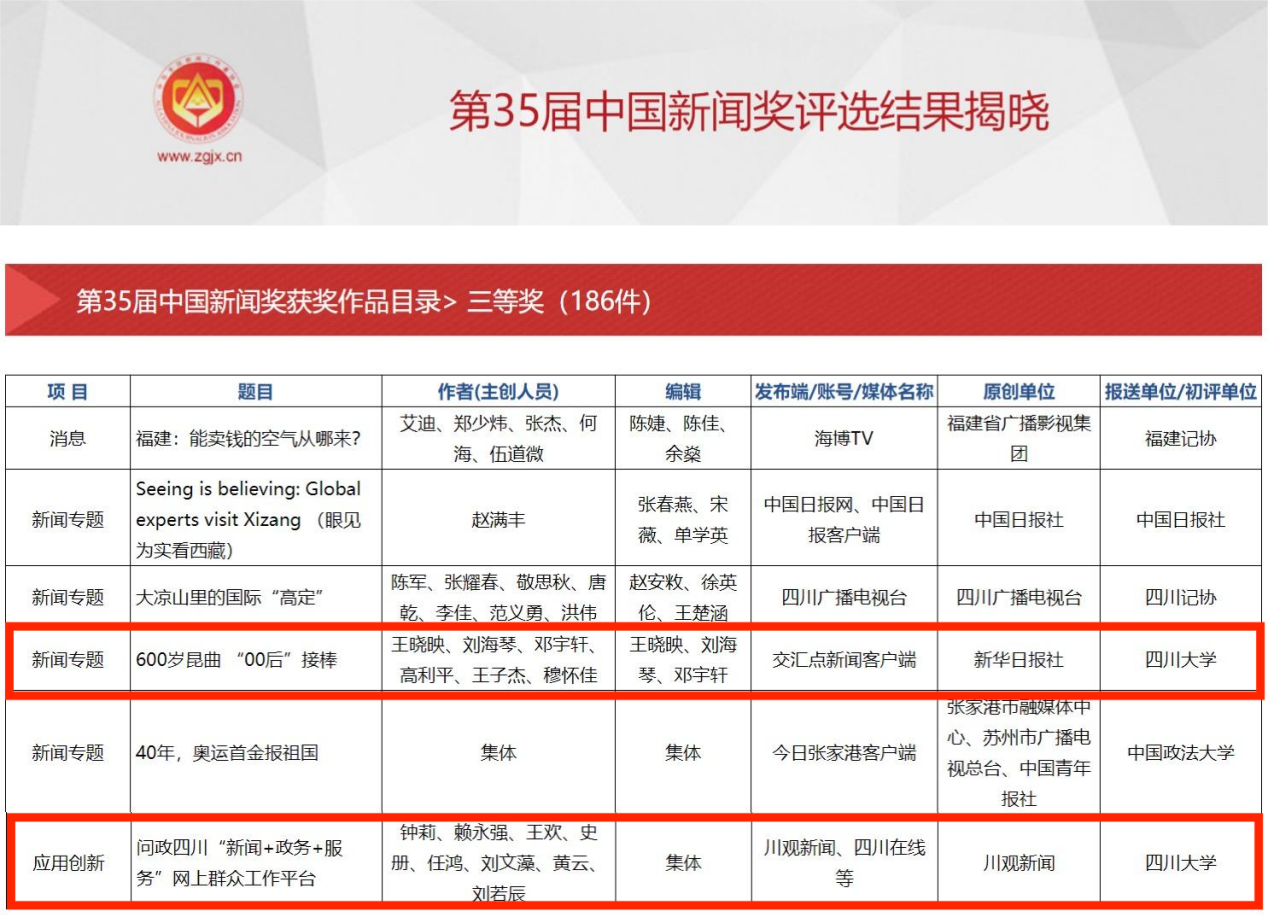 2025年11月5日,中华全国新闻工作者协会主办的第35届中国新闻奖评选结果揭晓。太阳成集团tyc151cc报送的新华日报社作品《600岁昆曲 “00后”接棒》和川观新闻作品《问政四川“新闻+政务+服务”网上群众工作平台》分别荣获新闻专题类和应用创新类三等奖。