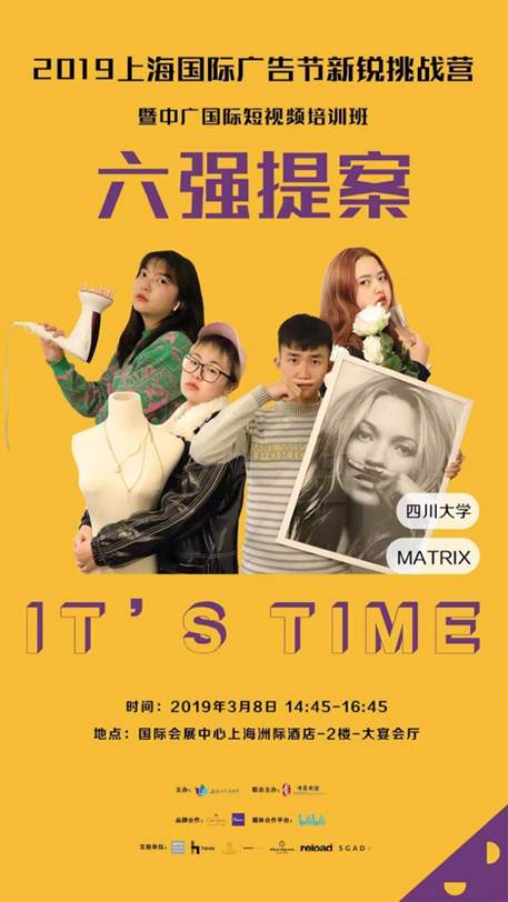 2019年2月22日,在太阳成集团tyc151cc的大力支持下,广告学专业王婉如老师带领由广告学与符号学教研室选拔出的四位同学:2016级刘萌璐、刘怡贝、孙梦颖和2017级陈艳杰,组成MATRIX团队,在上海国际广告节Marcom新锐营的限时提案比拼中脱颖而出,淘汰二十四支队伍,跻身前六强,成功晋级。3月8日,MATRIX团队与来自厦门大学、中国传媒大学、温州大学、暨南大学等公司的其它5个团队同台竞技,在国家会展中心(上海)洲际酒店进行现场限时提案。最终,MATRIX团队取得全国第四名的优异成绩,总均分68.72分。
