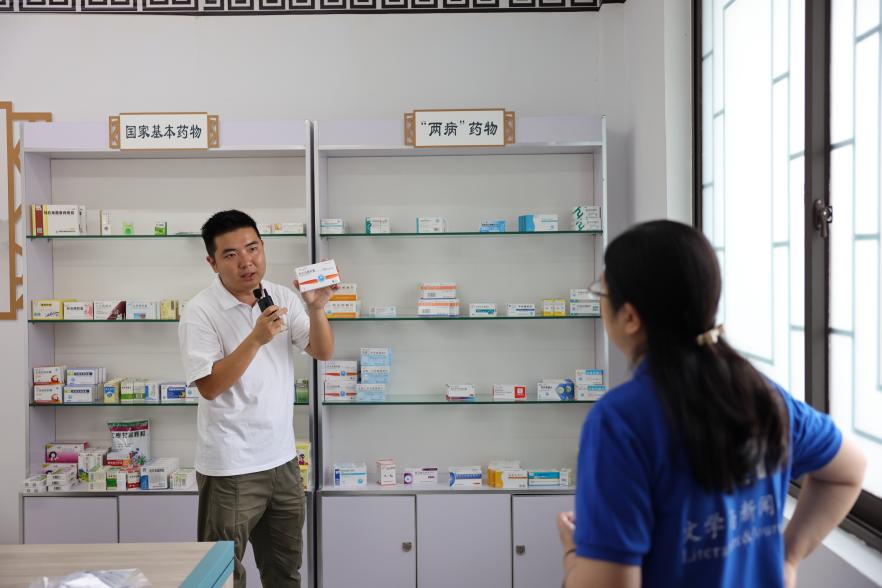 跟随总书记的足迹,师生们接续走访了村内的荷花池与卫生站。荷花池里,朵朵菡萏向阳绽开,配合池下精妙设计的污水处理系统,向大家描绘出永丰村焕然一新的生活面貌与生态慧思。卫生站内,张艺锋声情并茂地为师生们讲述了当日总书记考察永丰村的情景,他回忆道,总书记十分关心群众的健康,特意询问了当地高血压、糖尿病等重点疾病的医药价格,还叮嘱当地村干部:“老百姓的事,要实实在在干,干一件是一件,干一件成一件。”总书记的关怀与指示感染着在场师生,大家自发上前,仔细参观着卫生站内的一景一物,感受农村医疗的实际进步,用心领会总书记的谆谆嘱托,体悟四川持续增进民生福祉,大力推动乡村振兴的生动实践。