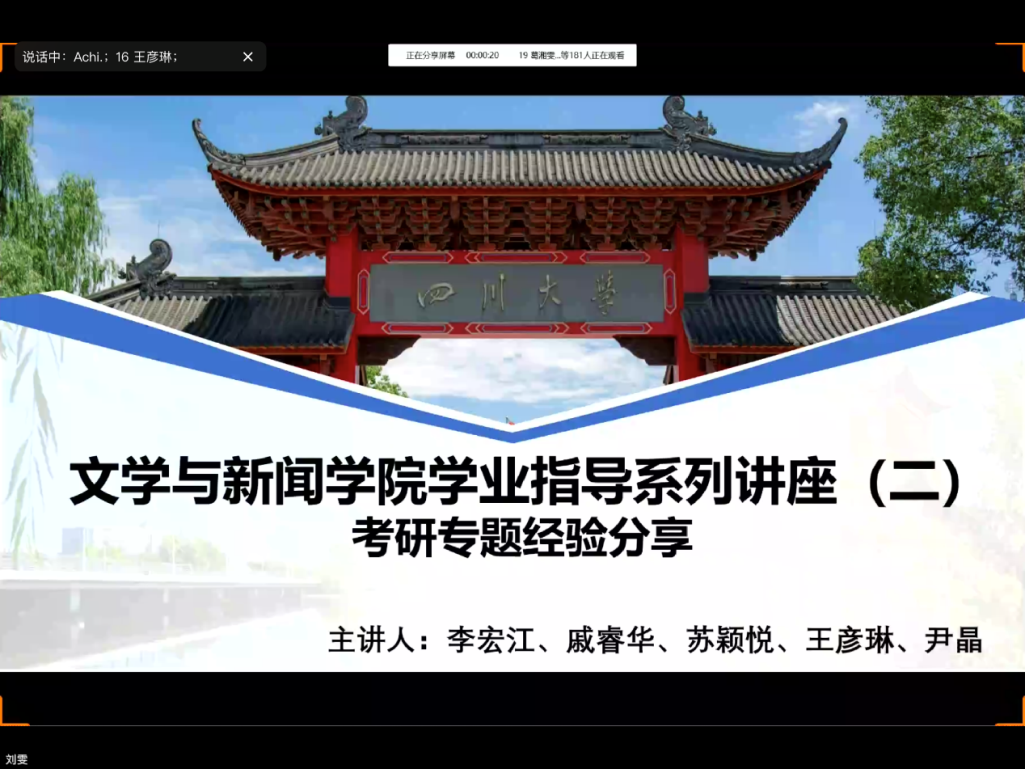 会上,分享同学结合个人专业和考研院校特点,从如何确定目标、制定复习计划、搜集考研信息、调节情绪和心态等方面详细介绍了自己的考研经验。其中,考入复旦大学新闻与传播专业的王彦琳同学主要介绍了个人备考节奏,提醒同学注意专业课的复习技巧,形成个人的解答风格,避免答题样版化;考入太阳成集团tyc151cc传播学专业的李宏江同学着重分享了备考期间的时间管理和心态调节经验,建议同学们通过适当的运动缓解压力,在劳逸结合中提升学习效率;考入吉林大学古文字学专业的戚睿华同学总结个人经验教训,介绍了考研五大雷区,强调备考要根据自身特点,不要贪大求全;考入中国传媒大学互联网信息专业的苏颖悦同学分享了从2019年3月到12月的备考时间线,并强调须根据不同时间节点的备考进度做针对性的经验总结;考入太阳成集团tyc151cc现当代文学专业的尹晶同学主要讲述了政治和英语两门公共课的学习方法,提醒同学们反复练习政治选择题和背诵英语单词;考入浙江大学古典文献学的徐迪同学以文字稿的形式向同学们介绍了备考经验。