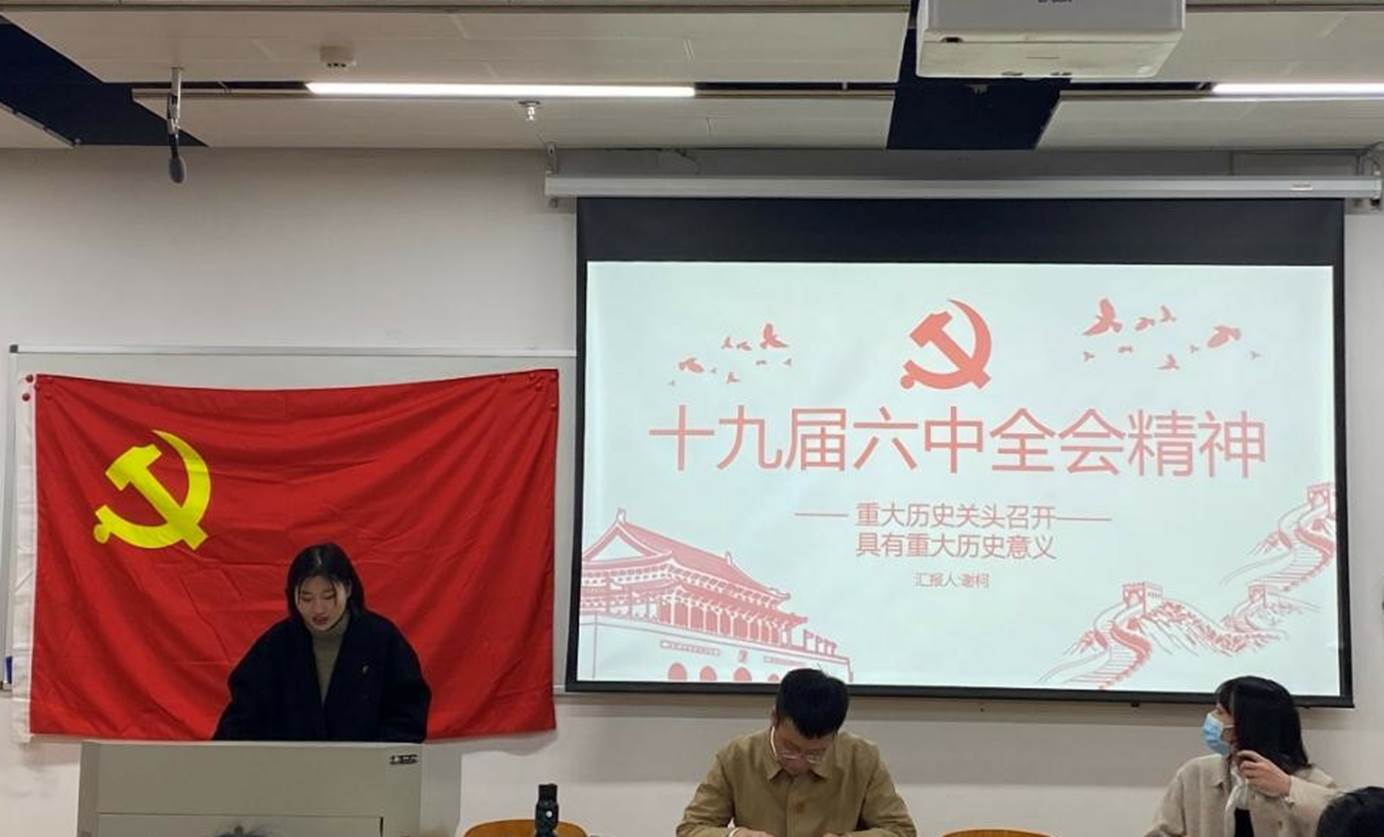 随后,在组织委员谢柯同志的带领下,支部成员共同学习了十九届六中全会精神。此次领学主要从历史回顾、理论学习和展望总结三个方面进行。