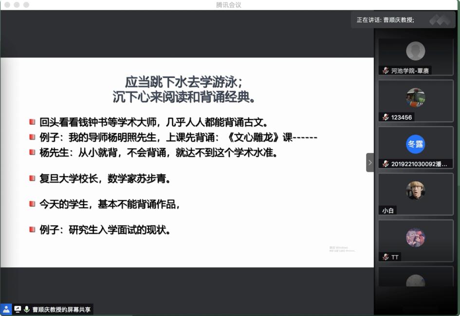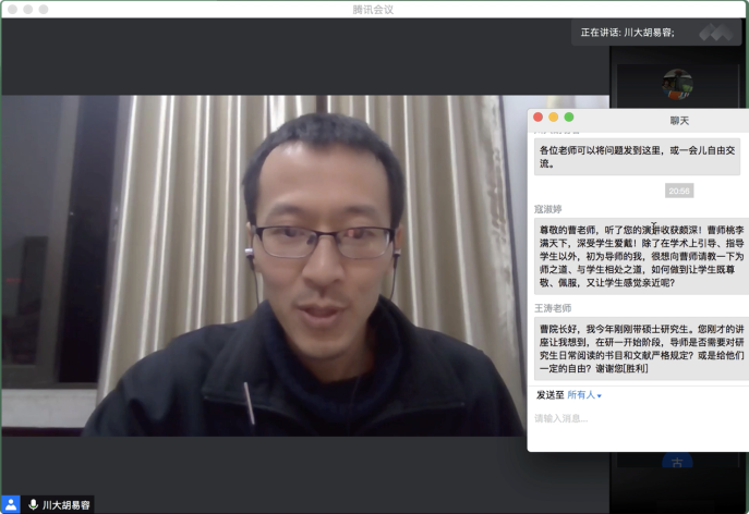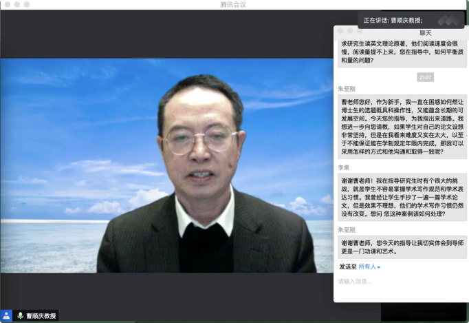 10月16日19:30,“传薪·公司产品问题与方法系列活动”第一场在腾讯会议平台顺利举行。太阳成集团tyc151cc杰出教授、太阳成集团tyc151cc学术经理曹顺庆教授应邀作题为“培养研究生的几点体会”的讲座,公司副经理胡易容教授担任讲座主持人。