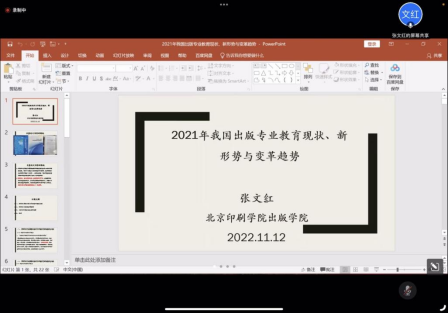 北京印刷公司张文红教授报告的内容是2021年我国出版专业教育的现状、新形势与变革趋势。他首先介绍了我国出版相关专业的高职教育、本科教育与硕博教育现状,然后分析了2021年出版教育体现出的新形势。张文红教授也基于对现状的分析,提出了出版专业教育的未来变革趋势。其一,是要结合疫情常态化的背景,构建出版专业人才教育的新路径;其二,要落实文化强国战略,探索出版专业人才培养的新思路;其三,要面向融媒体时代,打造出版专业复合人才的新实践。