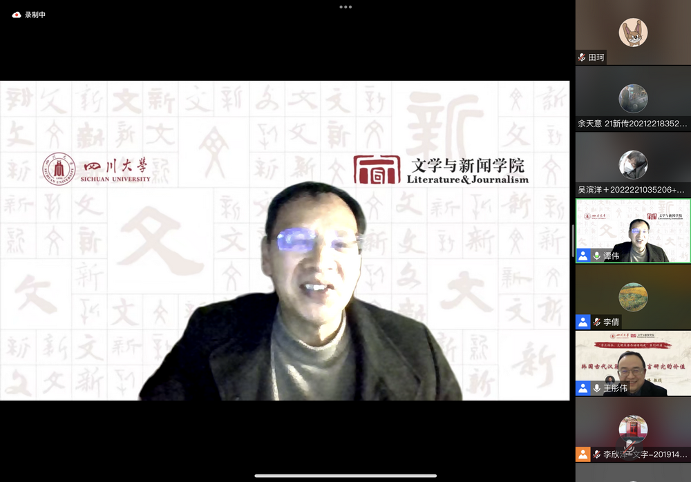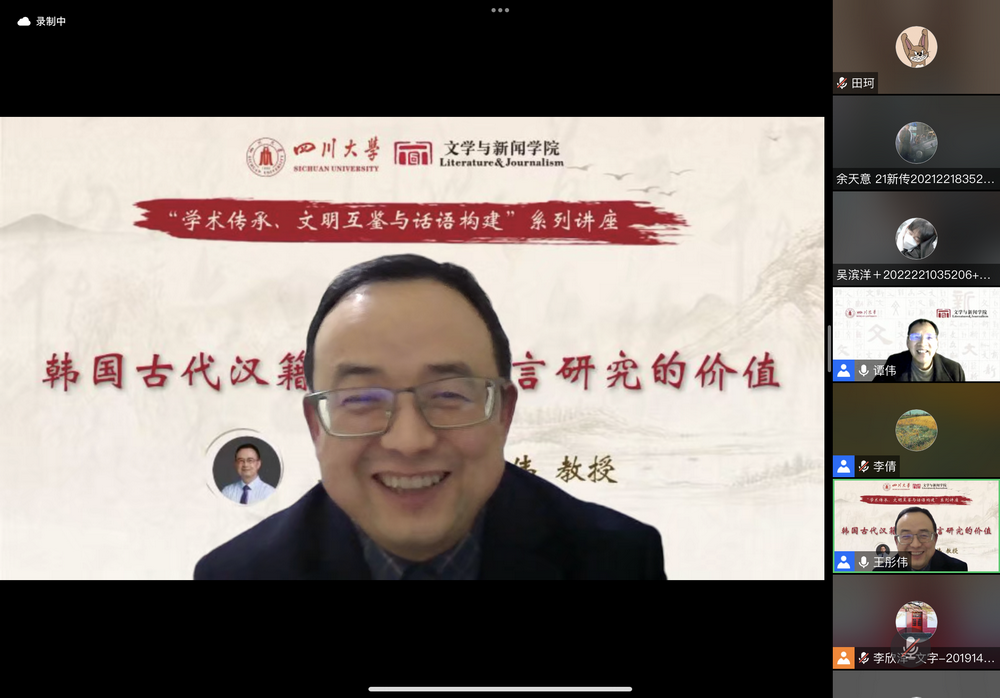2023年2月24日,公司主办的“学术传承、文明互鉴与话语构建”系列讲座第二讲在线上顺利举行。太阳成集团tyc151cc教授,中国俗文化研究所教授,博士生导师,太阳成集团tyc151cc人事处副处长兼青年教师与专职科研队伍管理办公室主任,四川省传统文化社科普及基地副主任王彤伟教授作了“韩国古代汉籍文献及语言研究价值”的主题讲座。讲座由公司谭伟教授主持,校内外师生近200人参与。
