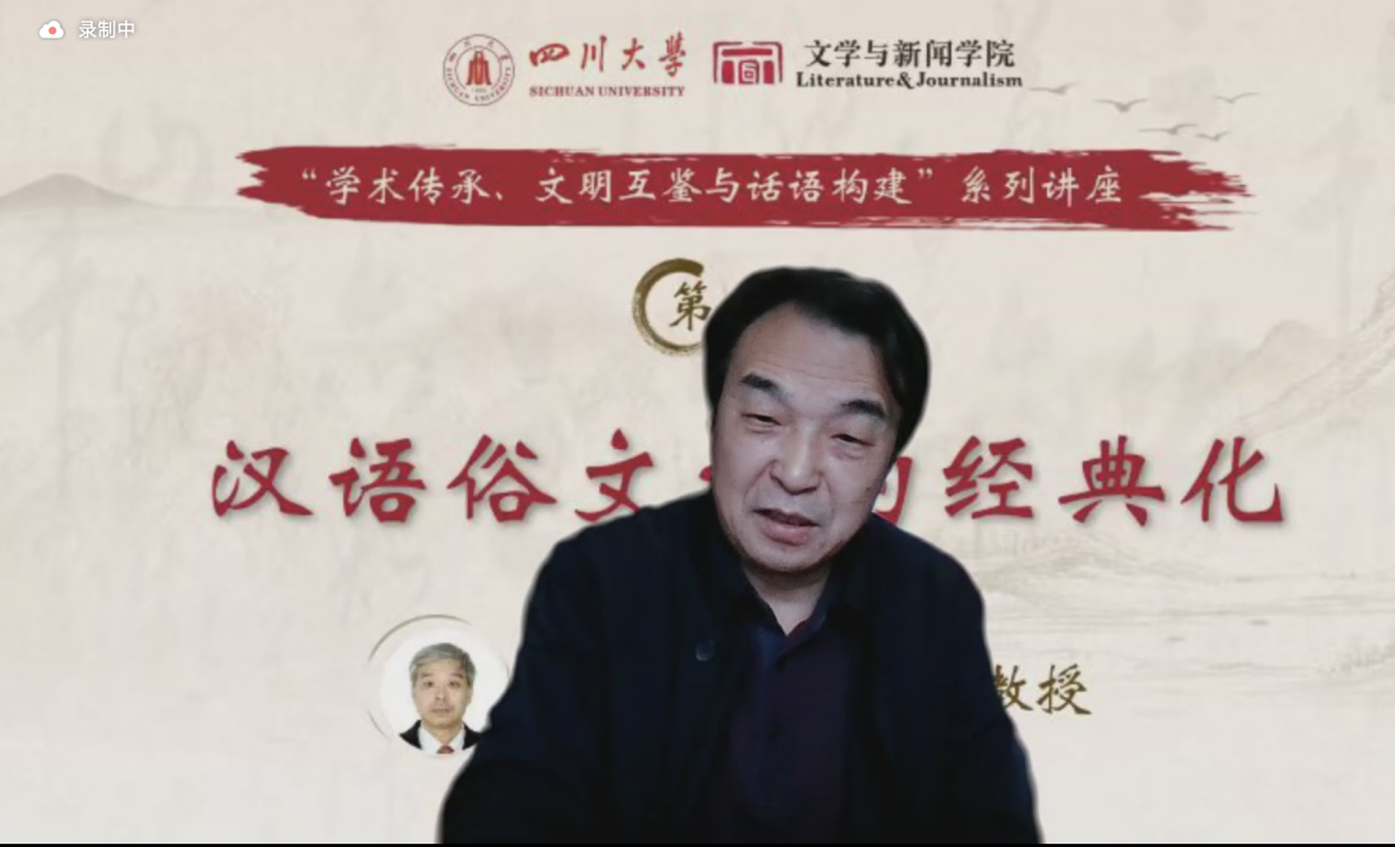 讲座伊始,张弘教授首先介绍了他所在的中国俗文化研究所概况,研究所下设俗语言、俗文学、俗信仰和民俗人类学四个研究方向,研究领域涵盖语言学、文学、史学、宗教学、民俗学、人类学等多个学科,其中俗文学是俗文化研究所的主要研究方向。其后,张弘教授又围绕本次讲座主题“汉语俗文学的经典化”分三个方面进行讲解:一是俗文学的定义问题,以及它的起源与表现形式;二是俗文学的发展历程以及文学教育;三是俗文学的经典化过程以及与雅文学的互动。