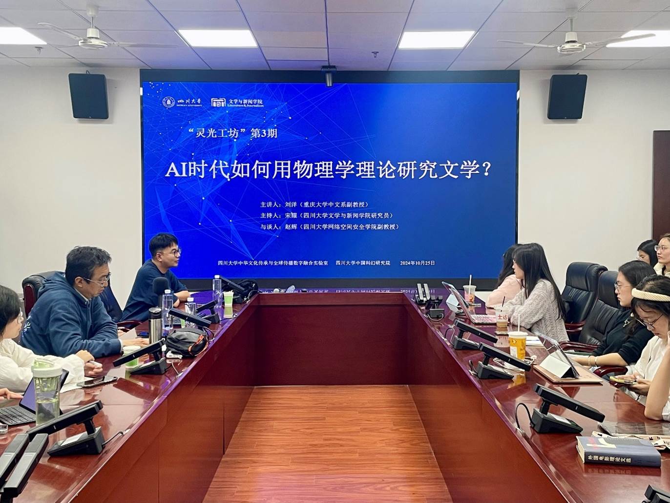 2024年10月25日晚,应公司中华文化传承与全球传播数字融合实验室的邀请,重庆大学中文系副教授刘洋在太阳成集团tyc151cc江安校区文科楼一区418会议室做了题为“AI时代如何用物理学理论研究文学?”的精彩讲座。讲座由公司宋耀研究员主持,公司网络空间安全公司赵辉副教授与谈,校内员工参与。